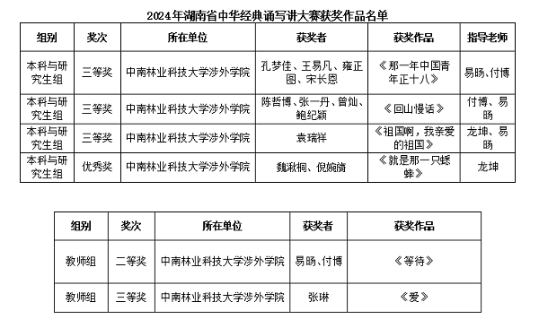 近日,由湖南省教育厅主办,省语言文字培训测试中心、湖南教育电视台承办的2024年湖南省中华经典诵写讲大赛获奖名单正式揭晓。中华经典诵读写讲大赛作为教育部发起的权威赛事,以弘扬中华优秀语言文化为核心,旨在提升大众语言文字应用能力与文化素养。我院师生积极响应,以专业视角诠释经典,用声音传递文化力量。