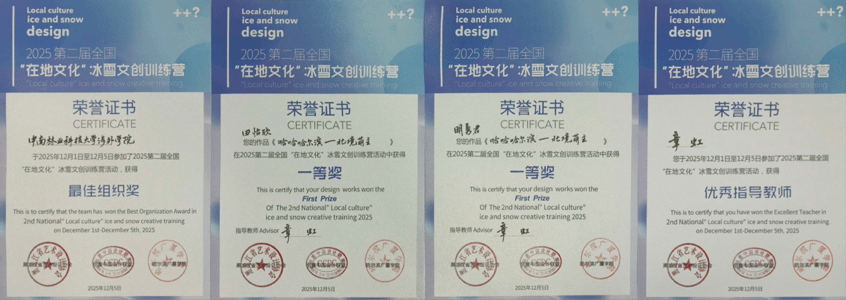 近日,第二届全国“在地文化”冰雪文创训练营圆满结束。我院由章虹老师带队,2024级视觉传达国际实验班田怡欣同学、2022级产品设计2班明勇君同学组成的参赛团队,凭借扎实的专业能力与良好的团队协作,在全国多支队伍中脱颖而出,荣获一等奖。学院同时获评“最佳组织奖”,章虹老师获“优秀指导教师奖”。