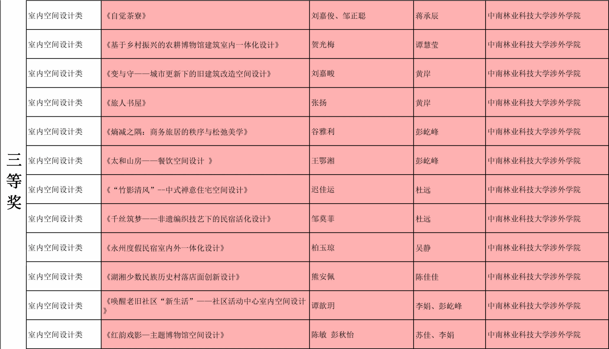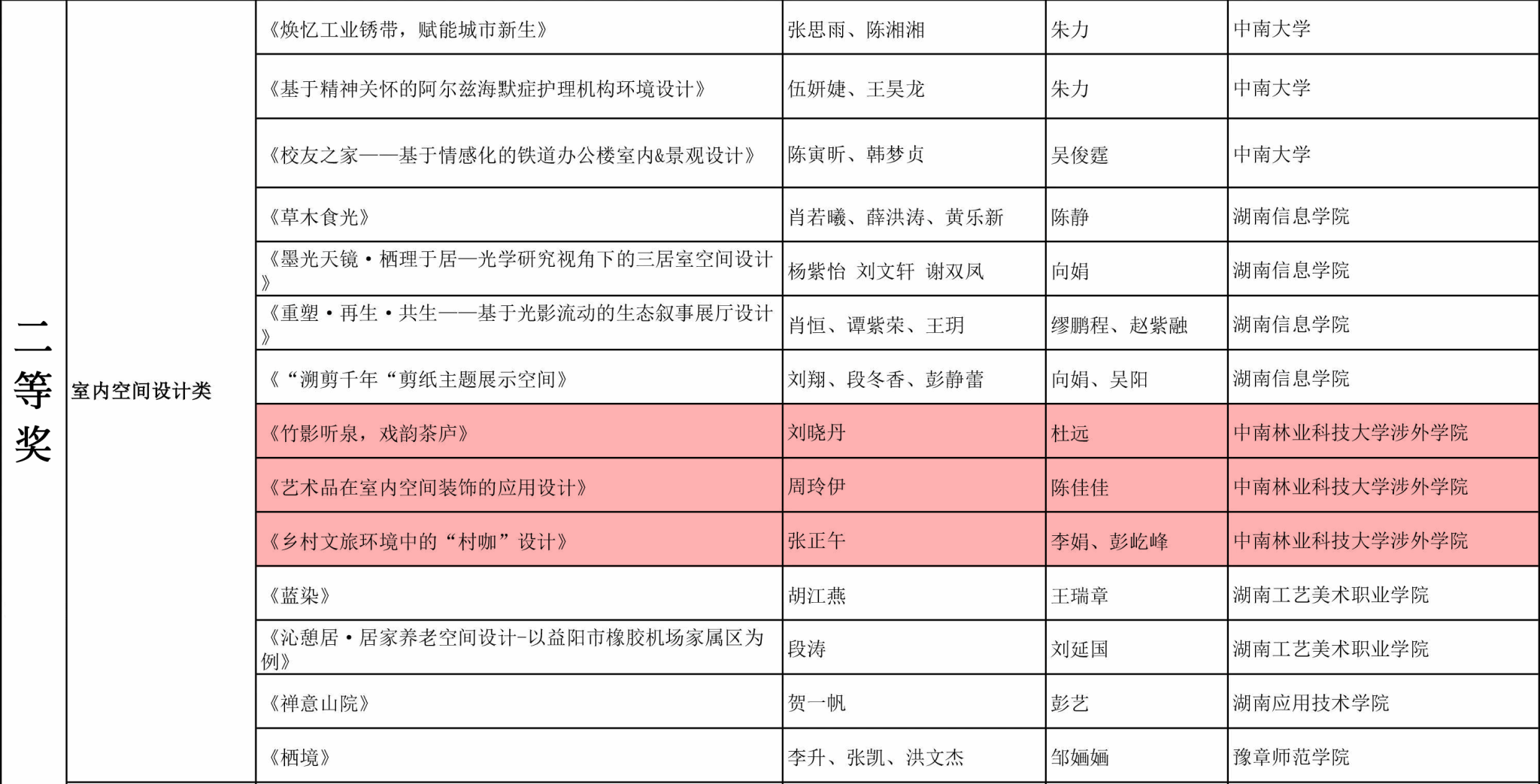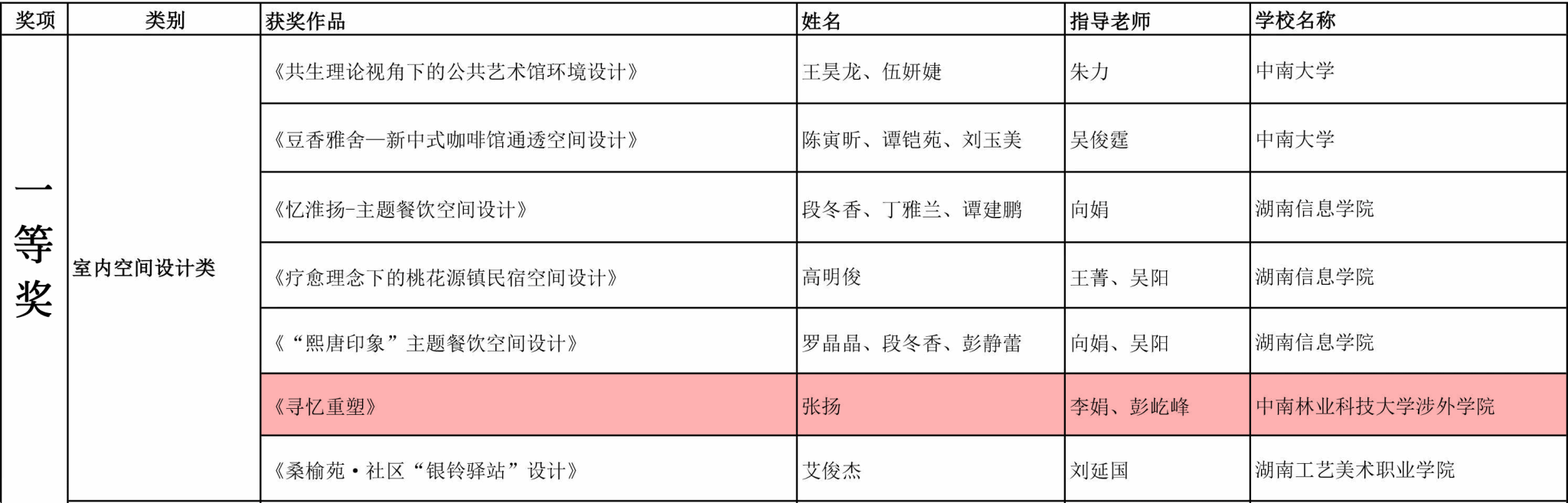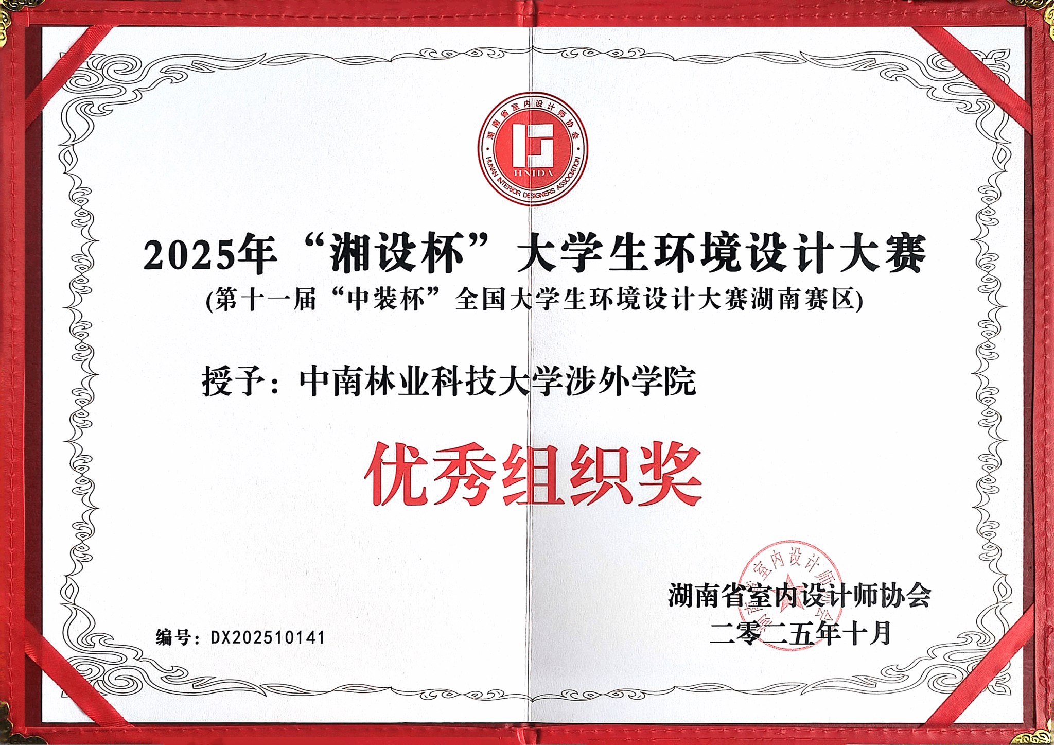 近日,第十一届“中装杯”全国大学生环境设计大赛湖南赛区暨2025年“湘设杯”大学生环境设计大赛获奖名单正式揭晓。我院学子共斩获一等奖1项、二等奖3项、三等奖12项,获奖数量与质量均位居参赛院校前列。环境设计教研室彭屹峰、李娟、陈佳佳、杜远四位老师荣获“优秀指导老师”称号,同时我院获评“优秀组织奖”。这一成绩充分展现了学子优秀的专业素养与师资队伍扎实的教学水平。