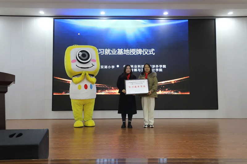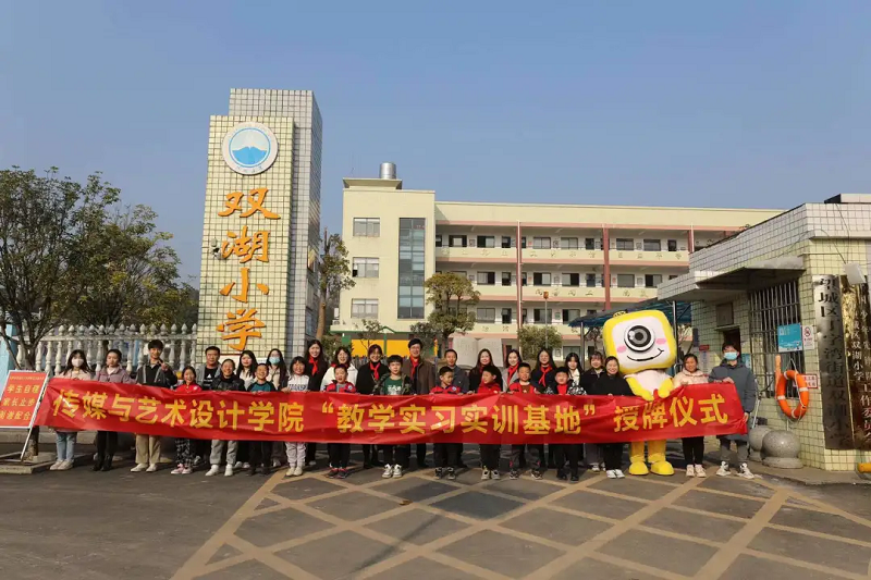 传媒与艺术设计学院副院长陈敏与双湖小学教导主任叶李为传媒与艺术设计学院“实习就业基地”揭牌。