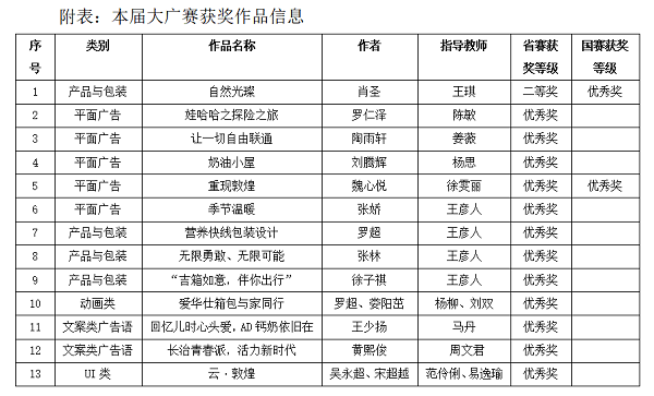 组织我校艺术设计相关专业大学生参加大广赛,无论是对教师的专业教学能力还是对学生的专业实践能力都具有极大的促进作用。以赛促练、以赛促学、以赛促教、以赛促改、以赛促研、以赛立德,把一群优秀的青年人聚集在一起,让他们的创造力互相激发,培养了他们的创新意识和解决问题的能力,展示了我校新一代大学生的才能,体现了自我价值,增强了自信心,滋养了他们的成长。