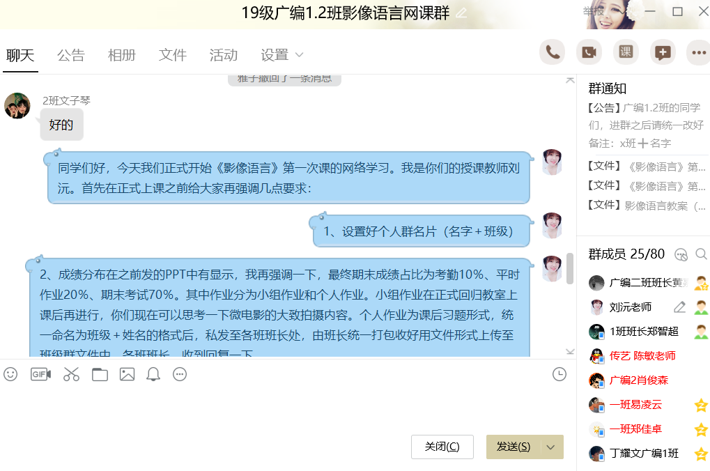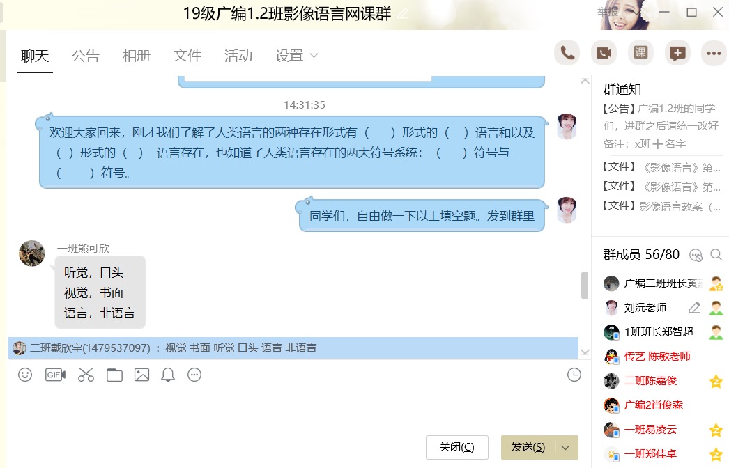 从本周一开始,我便为2019级编导1-4班的同学进行了网上授课,这个学期主要教授的是《影像语言》和《文化传播》两门课程。虽然是一种全新的授课方式但是由于之前同事们都在群里交流过授课方式和技巧,所以上起来也比较顺利。我运用的授课方式是中国大学慕课视频结合QQ群内答疑解惑的方式进行。在备课的时候,我结合慕课视频的具体内容设计好下节课的PPT和教学资料,在群内辅助讲解,并针对视频内容讲解不够详细、学生容易有疑惑的地方,提前做好笔记,结束视频观看后在群内与学生进行讨论和答疑。由于网络课堂增加了学生们的互动性,整体上课氛围比较活跃、积极。但由于网课的特殊性和局限性,可能对《文化传播》这类纯理论性的课程教授的困难性会更大一些。