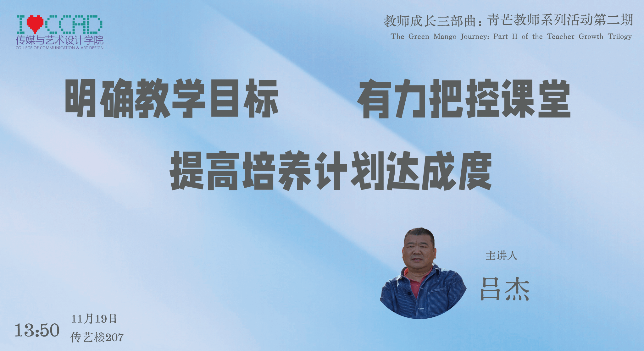 11月19日,传媒与艺术设计学院“教师成长三部曲·青芒教师系列活动”第二期在传艺楼207多功能会议室顺利举行。本次活动特邀基础教研室教授吕杰担任主讲嘉宾,主题为《明确教学目标-有力把控课堂-提高培养计划达成度》。副院长陈敏、院长助理易旸及2023-2025年新进教师共同参加本次活动。