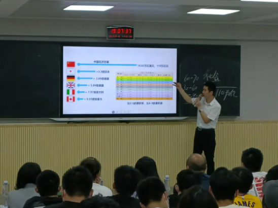 张康龙从教育发展和就业现状、国家安全和民族复兴、国际形势和世界格局、经济发展和社会进步的四个部分进行启发式授课。