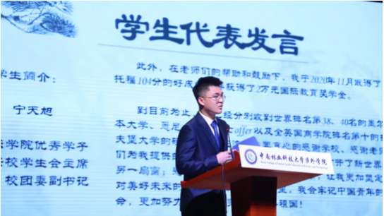 国际班学生代表宁天旭用一口流利的英语发言道:“感谢学校为我们提供了国际化成长锻炼的平台,让我们找到信心,重塑自我,从而让我们有机会走出国门,走向世界。”同时表达了对国际教育的肯定与感激。