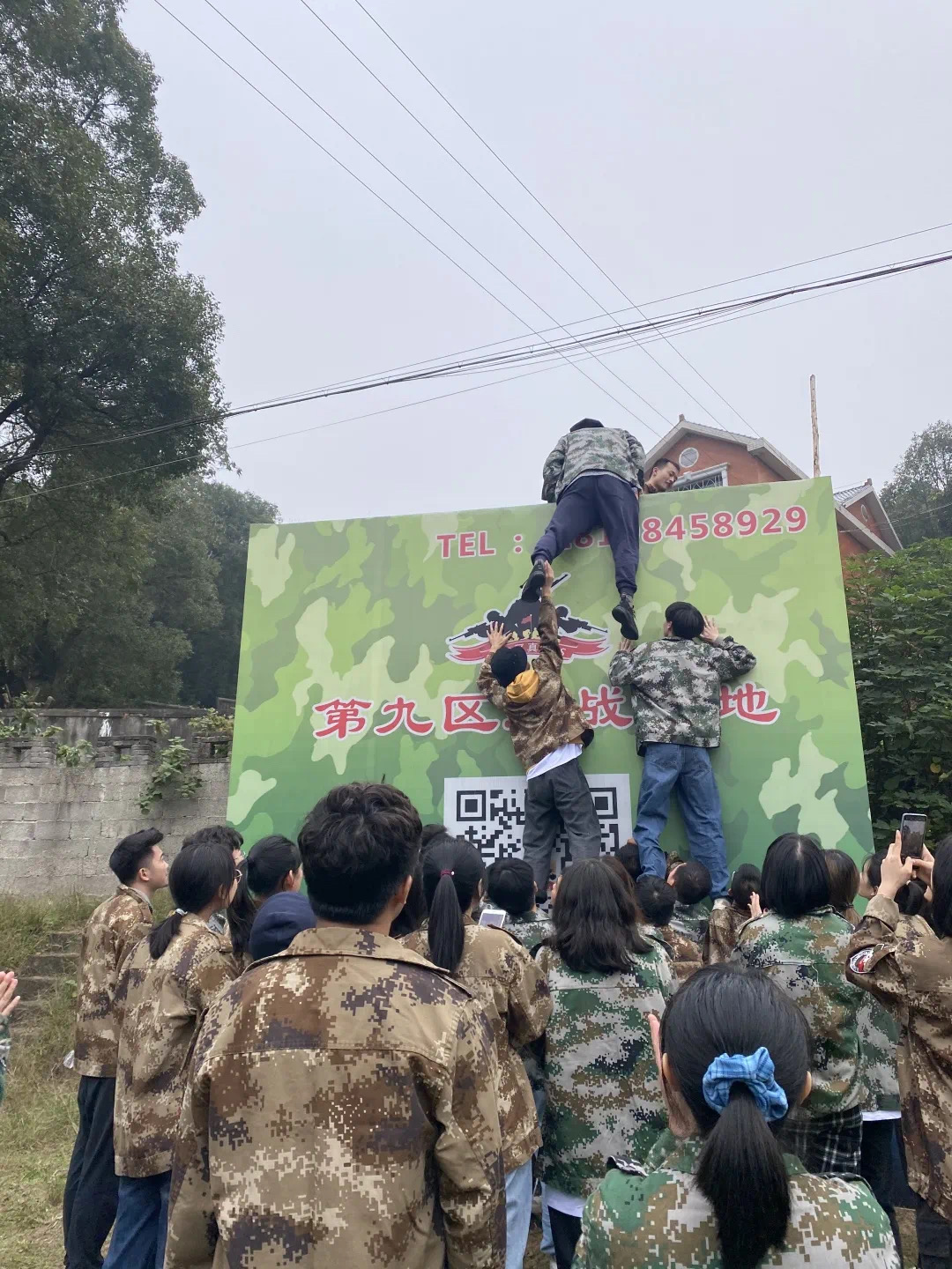 这是一项极为考验团队合作、团队精神的“越狱”活动。需要实现人体搭桥,确保每个人都能顺利上墙。