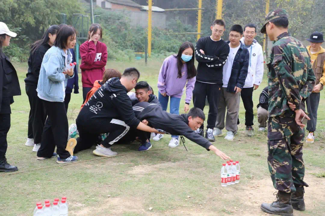 大家手牵手围成一个圈,转圈慢跑。待教官报数后,根据自己的数字进行抱团。淘汰者需用特定的成语造句,“奇形怪状” "歪七扭八"的句子引发了一阵阵爆笑。