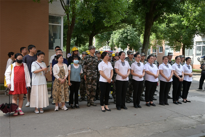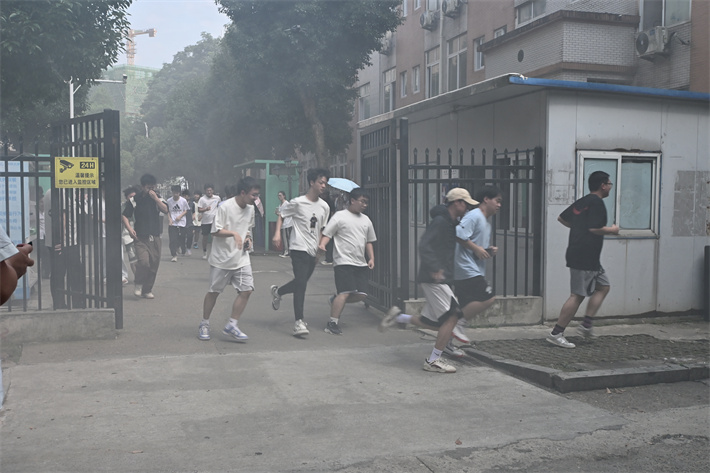 3、联动处置:灭火组全副武装奔赴现场,利用消防器材控制火势;疏散组引导千余名学生弯腰捂鼻,沿安全通道有序撤离;医疗组铺设担架,模拟伤员转运;后勤组迅速切断电源,架设警戒线防止无关人员进入。