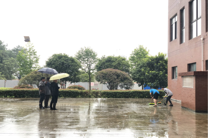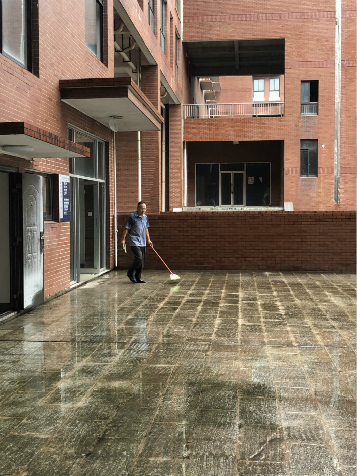9月17日下午,因持续雨天,路面湿滑,行走在教师公寓前坪的王仲南处长感觉路面有较大的滑倒风险,他二话不说拿起扫帚就沿着青苔路面一路清扫,保洁人员看到后意识到上午虽然用高压水枪冲洗过路面,但效果可能不尽如意,连忙召集人马带上草酸清洗剂对湿滑地域进行全面洗刷,经过齐心协力共同配合,保洁团队高效、快速完成了路面的青苔处理,让路过此地的师生多了一份安心,更多了一份安全!