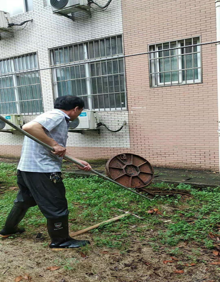 6月8日下午3点,17栋211宿舍因为厕所堵塞,导致污水蔓延至寝室,正在值班的维修员冷建国师傅在接到通知后的第一时间便赶往了现场。面对污水四溢的寝室,冷师傅沉着应对,他首先用长钳疏通厕所,然后抬开宿舍楼后方对应下水道井盖,对下水道进行疏通。而后,冷师傅又赶到211正下方对应的宿舍进行管道排污,拧开管道的瞬间,即使做了事先防备,但由于水压过大,冷师傅还是被污水溅湿了全身。看着宿舍逐渐褪去的污水,冷师傅露出了开心的笑容,浑然不知自己的衣服已湿透,而是急忙询问学生寝室是否有物品损坏,叮嘱学生们使用厕所的注意事项。211宿舍的同学们都被冷师傅无惧脏、苦、累的服务精神所感动并连声道谢。