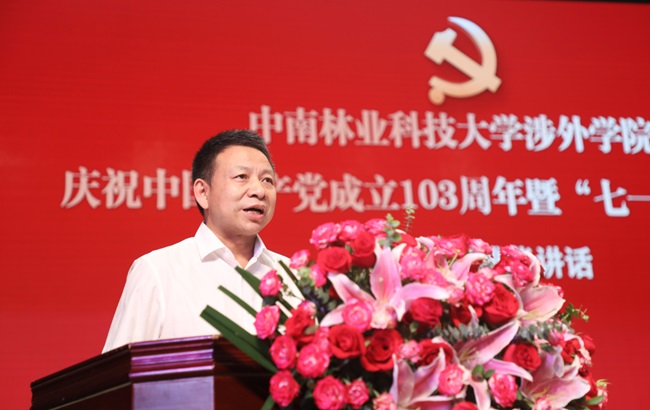 7月1日上午,中南林业科技大学涉外学院在学术报告厅隆重召开中国共产党成立103周年暨“七一”表彰大会,深入学习贯彻习近平新时代中国特色社会主义思想,重温党的光辉历程,弘扬党的优良传统,讴歌党的丰功伟绩,为光荣在党30年、25年的老党员颁发纪念章,表彰优秀共产党员、优秀党务工作者和先进基层党组织,激励学院各级党组织和广大党员干部初心不改、奋斗不息,走好新的赶考路。