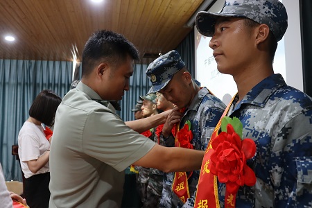 议程第一项,入伍新兵上台,文楚强政委、刘诗福院助为新兵佩戴“光荣入伍”大红花及绶带,并颁发慰问品。
