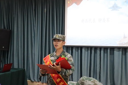议程第二项,管理学院2017级学生钟委军代表新兵进行发言,他首先对学院各位领导和老师不辞辛苦前来为新兵送行慰问表示感谢,并代表我院此次应征入伍的全体新兵郑重承诺:将尽快适应部队的生活环境,牢记使命扎根军营,在火热的军营里不断加强学习、刻苦训练、锤炼提升本领,把涉外人艰苦奋斗、不畏困难的精神带到军营,争取早日成为祖国的好战士,不辜负家长和学校的期望。