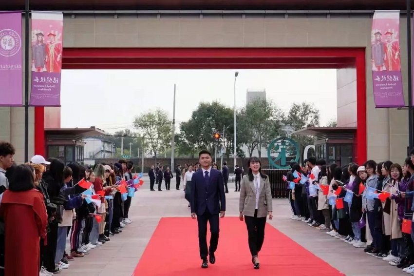 联合国人口基金驻华代表处代表洪腾博士及各位领导嘉宾与此次培训班的42名学员在学生礼仪的引导下踏上红毯,嘉华学院学生代表持中国国旗、联合国旗帜在红毯两侧列队欢迎,嘉宾与学员们在签名墙前签名、合影留念。