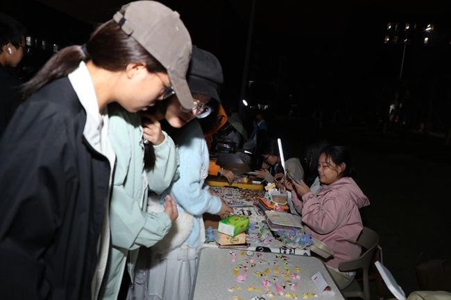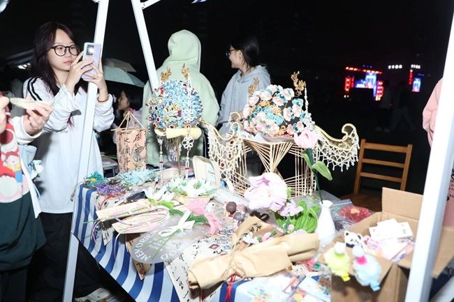 夜幕初垂,活动现场已是灯火璀璨、人声熙攘。舞台上,歌声与掌声交织成青春的节拍;舞台下,热闹的夜市随之点亮,各色摊位前人群络绎不绝。非遗文创区格外引人驻足,精巧的手作在暖光映照下娓娓诉说传统之美。不远处的义卖区也温情流动,一件件闲置物品承载着善意在手中传递。整个现场沉浸在轻松欢快的氛围中,既有青春的跃动,也有人情的温度,更在流光溢彩间弥漫着浓郁的文化气息。