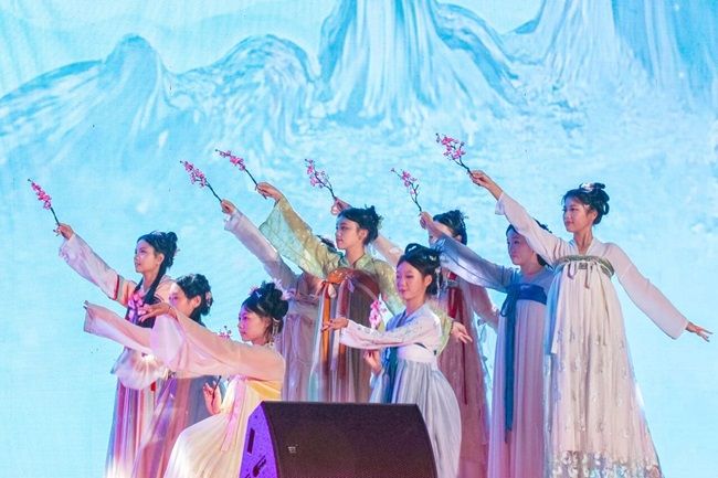 舞蹈《且听春吟》舞姿翩跹,罗裙摇曳,如春风拂面,尽情挥洒年少风华,于繁忙学业外舞动出对美好生活的礼赞。