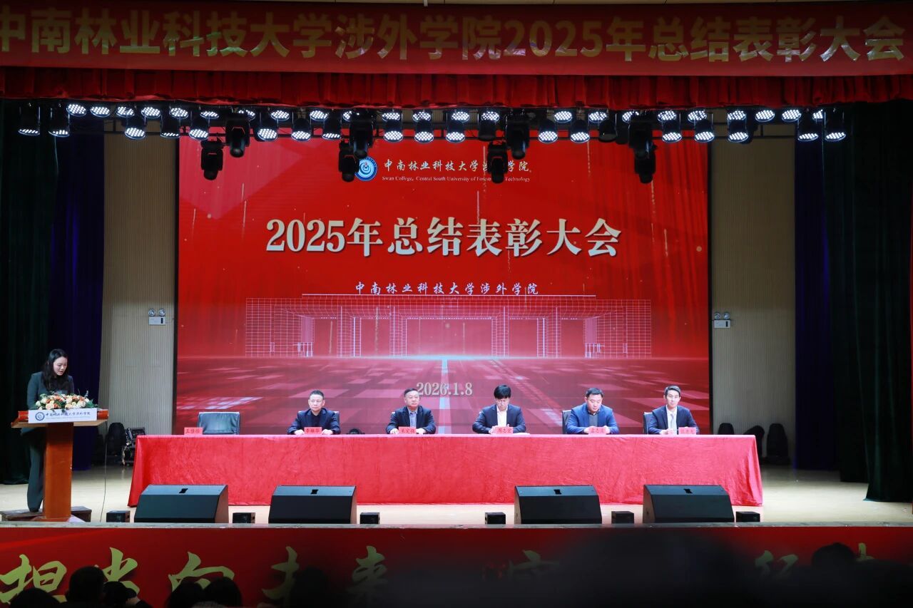 岁序更替,华章日新;弦歌不辍,奋楫争先。为全面总结学院2025年各项事业发展成果,表彰一批为学院高质量发展作出突出贡献的先进集体与优秀个人,1月8日下午,中南林业科技大学涉外学院2025年总结表彰大会在学术报告厅隆重举行,学院领导朱定强、周志宏、李雄华、孟志波、张康龙、王佳怡出席本次大会,全体教职工齐聚一堂,共同回顾奋斗历程,展望发展蓝图。大会由副院长王佳怡主持。
