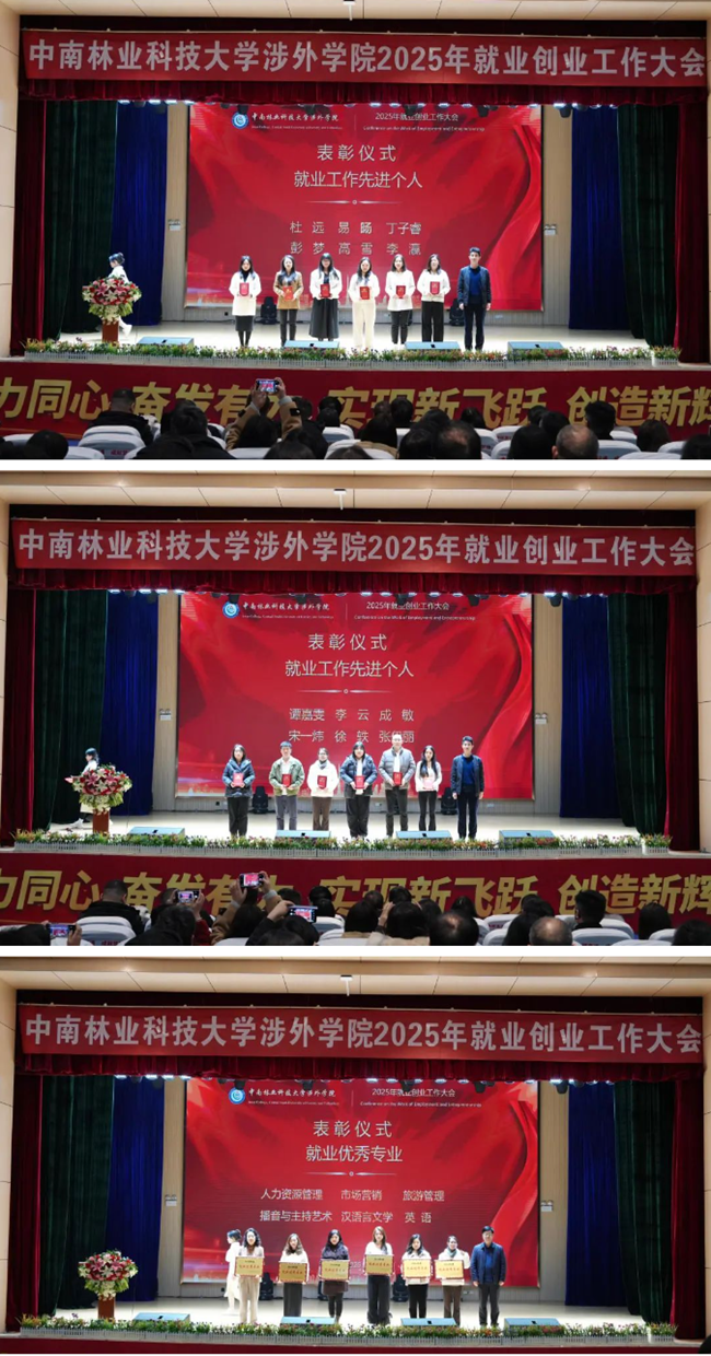 副院长张康龙宣读《关于表彰2024年度就业创业工作先进单位、先进个人和优秀专业的决定》与会领导为受表彰的个人、专业、单位颁奖