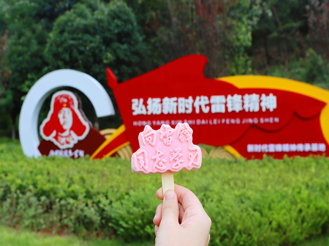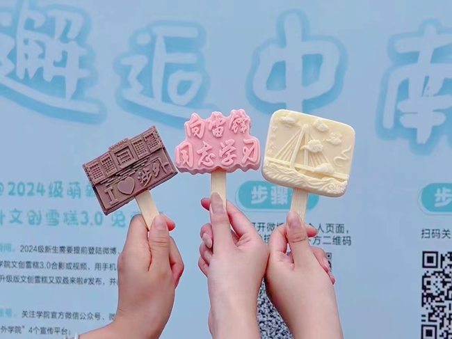 在开学之际,学院通过印有“向雷锋同志学习”的文创雪糕3.0,赋予了新生们入学的第一堂“大思政课”以生动的形式,引导7200余名新生融入校园,融入雷锋故里,让学雷锋活动融入日常、化作经常。