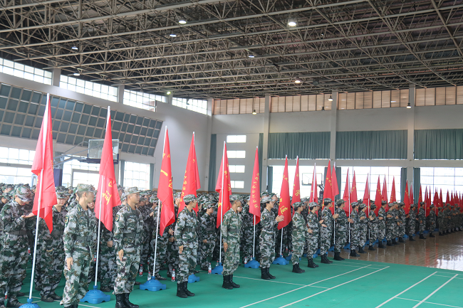 伴随着雄壮激昂的国歌,全体庄严奏唱,激昂的旋律在馆内回荡,军训动员大会正式拉开帷幕。