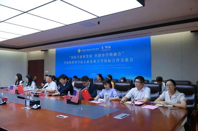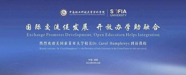 9月10日下午,中南林业科技大学涉外学院与美国索菲亚大学召开了校际合作交流会。索菲亚大学校长Dr.Carol Humphreys 、索菲亚大学全球学院高级总监王雅俐、中南林业科技大学涉外学院董事长朱定强、院长周志宏、院长助理王佳怡、国际教育学院副院长梅宸及特邀嘉宾出席会议,此次国际合作交流会由院长助理王佳怡主持。