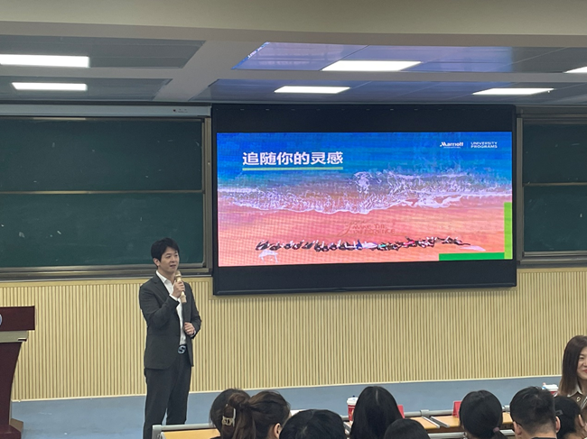 随后,在旅游管理教师的陪同下,朱程经理来到了1310教室,以“追随你的灵感——万豪国际集团全球领导力发展项目”为主题,与旅游管理专业的学生们进行了主题分享。