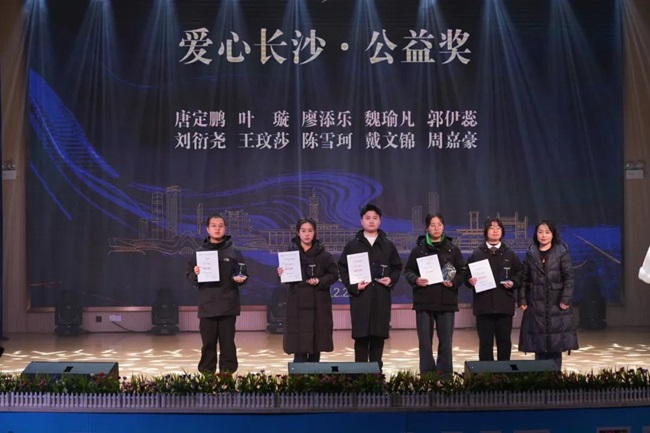 长沙市教育局办公室副主任、国际交流处副处长周卓莹为“爱心长沙·公益奖”获奖代表颁奖。