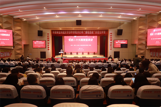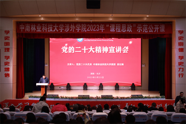 永远跟党走,奋进新征程。为深入学习宣传贯彻党的二十大精神,引导广大师生把思想和行动统一到党的二十大精神上来,将党的二十大精神切实转化为加快高质量发展的思路举措和履职尽责的实际行动,根据学院党委的统一部署,3月23日下午,党的二十大精神宣讲会在我院学术报告厅举行,党的二十大代表、中南林业科技大学袁红梅教授以《高举旗帜勇毅行,起航奋进正当时——深入学习贯彻党的二十大精神》为题做专题宣讲。学院领导朱定强、周志宏、章元日、盛均全、马宗艳、孟志波、张康龙、王佳怡,全体教职工以及学生代表参加了此次宣讲会,宣讲会由学院党委副书记孟志波主持。