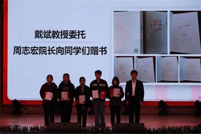 院长周志宏为在此次“思享+”学习沙龙活动中荣获一等奖的五位同学赠《旅游&信心》一书。此书为戴斌教授著作,每本书籍上都有戴教授亲笔签名以及对五位同学的寄语。