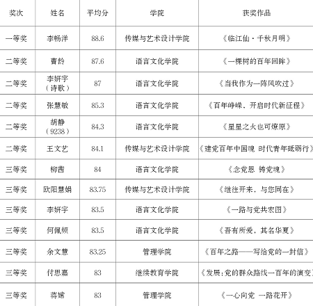 本次征文活动的评审过程坚持公正、公平、公开以及原创性原则,主办方特邀思政课部姚湘莲老师、汉语言文学教研室纪望书老师、曾懿老师、闫泽茜老师组成评审委员会,采取查重及匿名评选的方式,先后经历了初评、复评、终评三轮评选,最终评选结果公示如下: