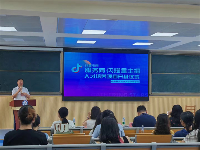 6月9日,中南林涉外学院抖音电商服务商·闪耀星主播人才培养项目“聚星训练营”在第一教学楼1310会议室成功举行开班仪式。学院董事长朱定强、党政办公室负责人粟臻、管理学院副院长肖菲、经济学院副院长胥若男、聚星超媒科技有限公司高校事业部总监胡清、抖音电商闪耀星主播项目负责人王姣姣、宋子恒出席开班仪式,经济、管理学院师生代表参加活动。