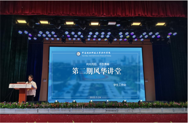 为充分发挥榜样力量,激励广大学子坚守理想,刻苦学习,勤于实践,砥砺奋进,学工处主办的第二期“风华讲堂”,以“向光而行,不负青春”为主题,通过全校学生投票与综合考评选拔出两名优秀学生作为主讲人,于5月24日晚在学术报告厅顺利开讲。