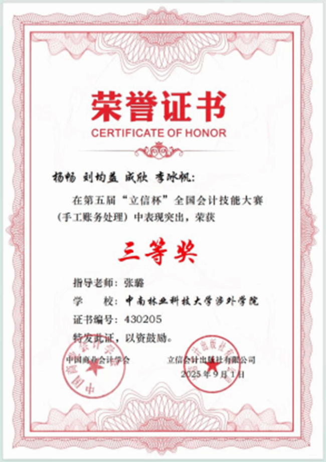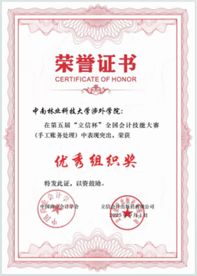 近日,第五届“立信杯”全国会计技能大赛圆满落幕。中南林涉外学院管理学院选派多支代表队参赛,凭借扎实的专业基础和出色的现场发挥,我院学子最终荣获全国一等奖1项、二等奖1项、三等奖1项,学院同时获评“优秀组织奖”,展现出扎实的实践教学成果。
