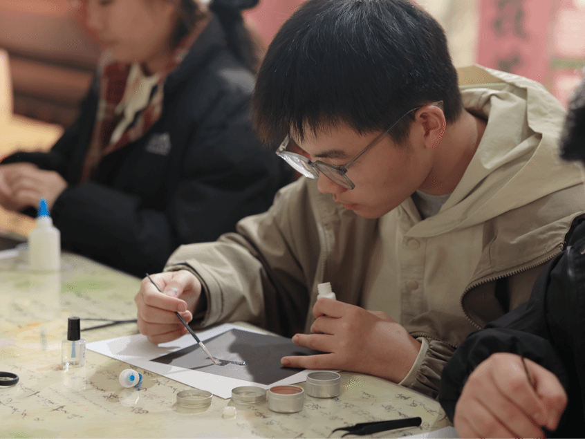 随后,学子们亲身体验拓印与螺钿技艺:以拓包轻叩碑刻,让文字在宣纸上重生;用螺钿细嵌图案,让传统色彩焕活新生。一件件亲手制作的拓片与螺钿画,不仅是技艺的传承,更是文化自信的具象化表达。