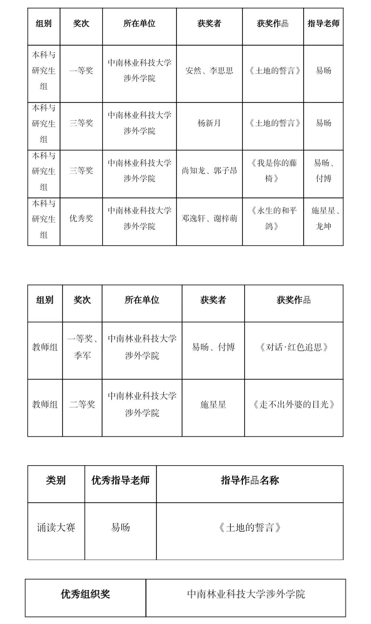 近日,2025年湖南省中华经典诵写讲大赛获奖名单正式揭晓。本次大赛由湖南省教育厅主办,中南林涉外学院传媒与艺术设计学院师生凭借扎实的专业功底、精湛的艺术表现和深厚的文化素养,在大赛中脱颖而出,共荣获5项等级奖和1项优秀奖。其中,我院学子安然、李思思的作品《土地的誓言》荣获本科与研究生组一等奖;在教师组中,我院教师易旸、付博的作品《对话·红色追思》不仅荣获一等奖,更在省诵读大赛七个组别的总决赛中荣膺季军,易旸老师同时获得优秀指导教师奖,此外,我院还荣获优秀组织奖。