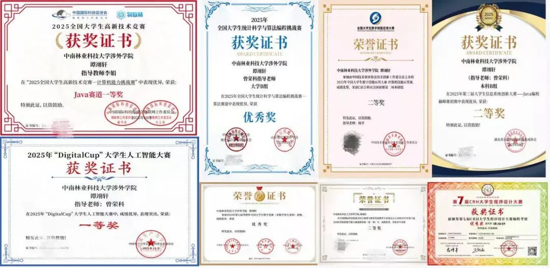 在积极投身志愿服务的同时,谭翊轩始终牢记学生本分,扎实完成学业任务,位居专业前列。他主持的课题《基于变分自动编码器和多轮K-means++聚类算法的学习者画像构建方法》获评校企合作大学生研究性学习和创新性实践计划重点项目;撰写的学术论文已进入省级期刊审稿阶段。截至目前,他已累计获得各类学科竞赛奖项30余项。