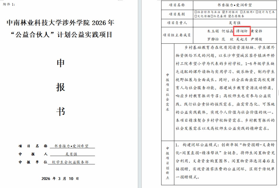 2026年3月,他作为核心成员参与的“公益合伙人”计划公益实践项目——“书香接力·爱润希望”在学院成功立项。该项目由中南林业科技大学涉外学院社会公益学院主办,旨在整合校地资源,推动公益服务常态化、专业化。