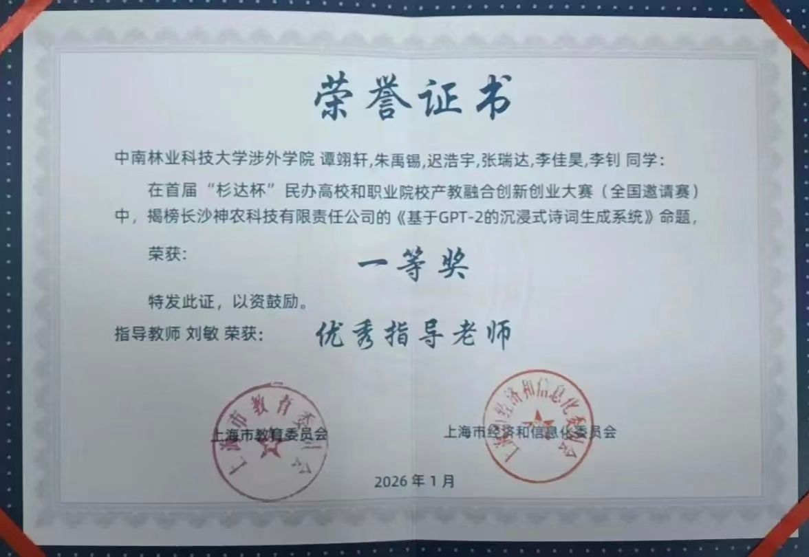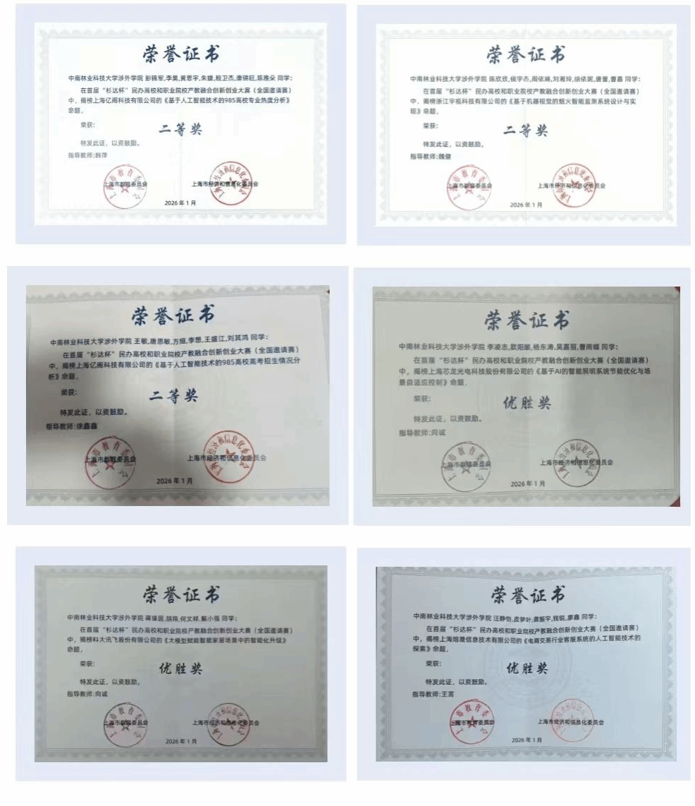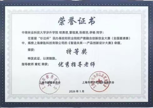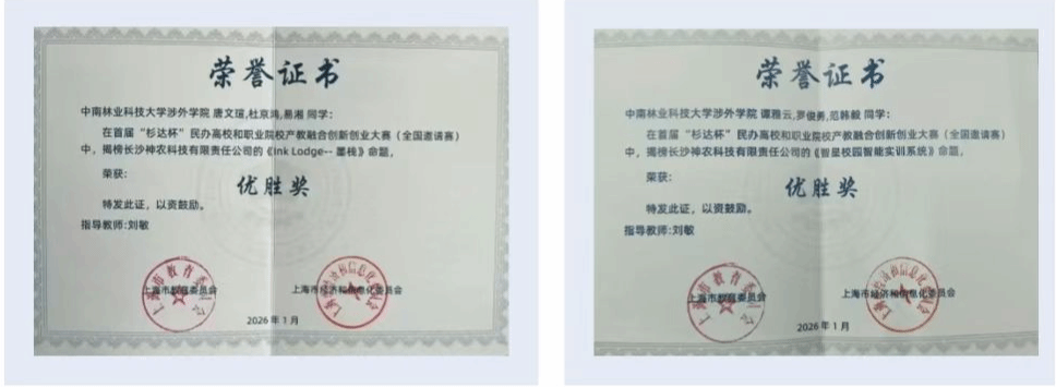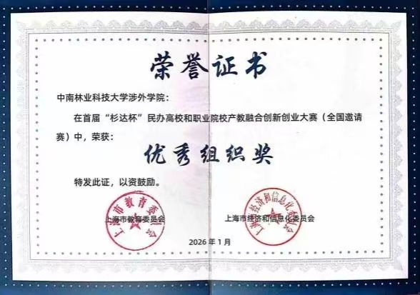 此外,章虹、刘敏两位老师获评“优秀指导教师”,中南林业科技大学涉外学院荣获“优秀组织奖”,充分彰显了学院在人才培养和产教融合方面的突出成效。