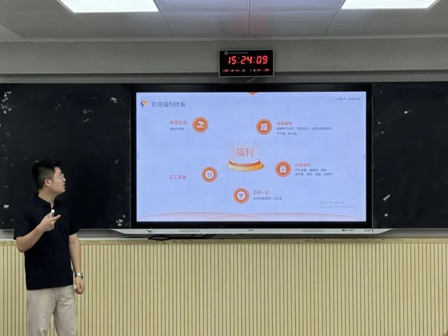 宣讲会现场,珍岛集团华中大区校招负责人朱遥先生详细介绍了公司的基本信息、发展历程、主营业务以及在行业内的领先地位。她强调了公司对于人才的重视和期望,特别是针对经济与管理学院相关专业的毕业生,提供了多个具有吸引力的岗位。同时,校招负责人还就公司的招聘流程、薪酬福利、晋升机制等方面进行了详细介绍,让在场的学生们对珍岛集团有了更加全面和深入地了解。