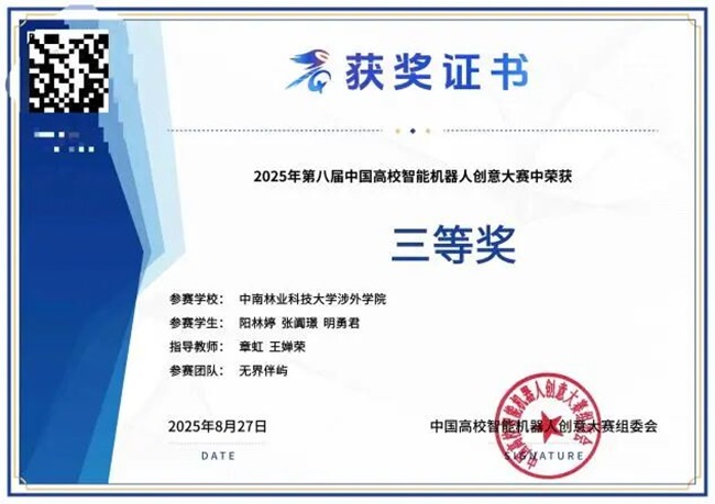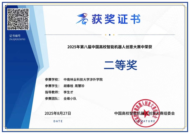 此次优异成绩是我院持续推进“以赛促教、以赛促学、赛教融合”人才培养模式的重要体现。长期以来,中南林涉外学院注重跨学科协作与创新能力培养,鼓励学生将理论知识与实践项目相结合,在高水平竞赛中锻炼解决实际问题的能力。未来,学院将继续深化教育教学改革,积极组织学生参与各类学科竞赛,进一步激发创新潜能,提升综合素质,努力培养更多适应社会发展需要的高素质创新型人才。