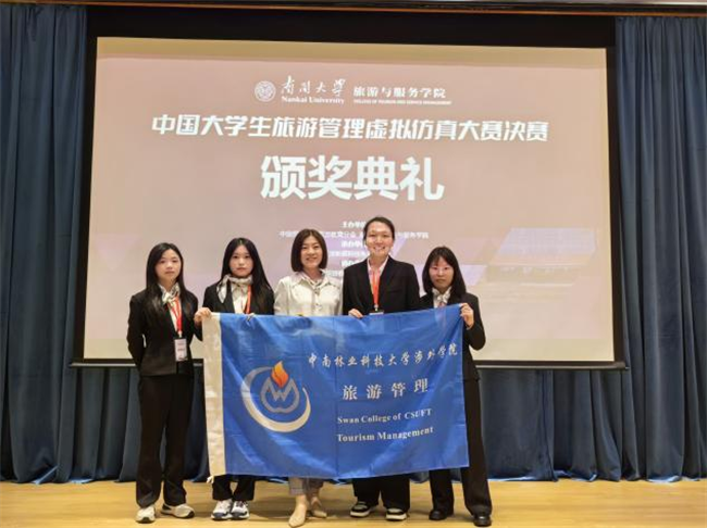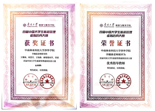 2023年5月29日,首届中国大学生旅游管理虚拟仿真大赛在南开大学拉下帷幕。我院由李穗菡老师指导的2020级王馨侦、2021级廖楚楚、王怡静、周慧芳组成的“白金翰管理层”,在决赛中荣获“优秀团队奖”,指导老师荣获“优秀指导教师”的称号。