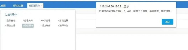 注意:短信预约前请操作第2、3、4项,完善个人信息、中学信息、家庭信息。