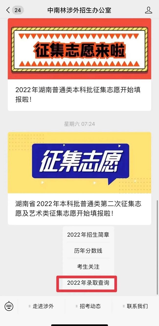 方式二:进入“中南林涉外招生办公室”公众号,点击“招考动态”→“2022年录取查询”。