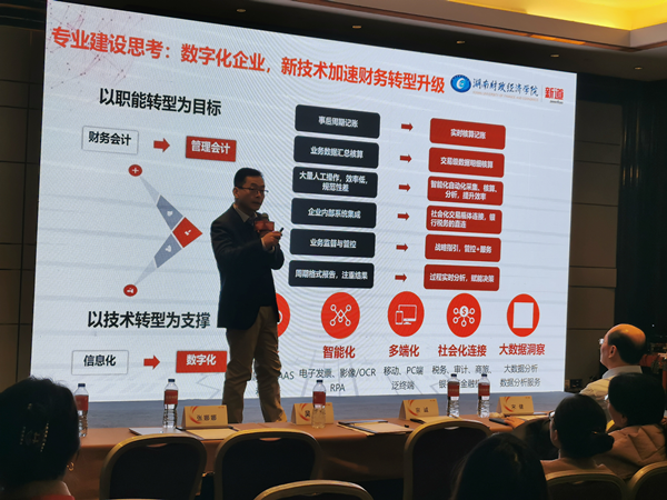 湖南财政经济学院会计学院潘彬院长做“国家级双一流专业建设和金课建设实践”演讲。潘院长指出,面向未来信息技术推动产业模式变革与创新,坚持贯彻“宽口径、厚基础、强能力、高素质"的方针,培养德、智、体、美、劳全面发展,具有良好的道德品质、扎实的专业知识、较深厚的人文底蕴、强烈的创新意识和宽广的国际视野,熟练运用大数据和人工智能技术对企事业单位的相关信息进行分析、决策和评价,能够在大中型企事业单位从事相关专业的工作。最后,潘院长就会计学的人才培养方案进行了详细讲解,这对金融学和国际经济贸易专业的新型人才培养方案具有指导性意义。