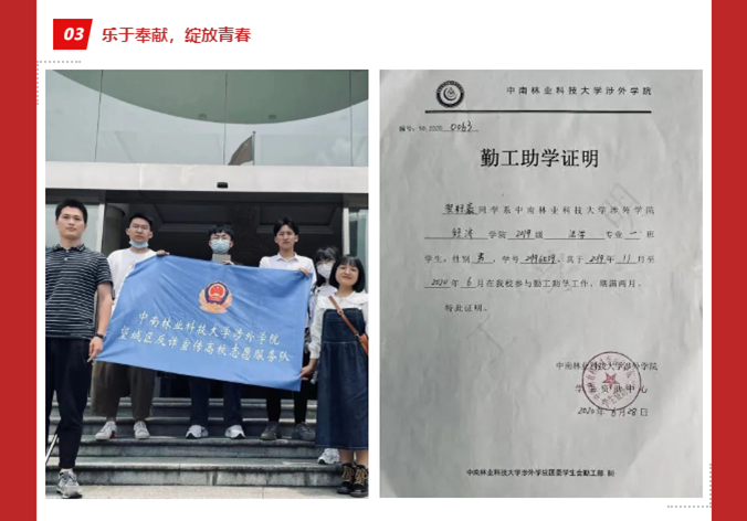 在学生会任职期间,他认真工作,多次参与组织大型活动:诺贝尔经济学奖得主马斯金教授来访活动、中国好声音(长沙赛区)校园赛、经济学院·知新论坛系列学术活动、党史知识竞赛等。作为党支部纪检委员,他多次协助支部书记出色完成支部五化建设工作,支部立项获评中南林业科技大学“创建样板党支部”。作为班长,他用实际行动来带动大家,做好班级的班风、学风建设。多次组织班级进行团建活动,所在班级连续两年被评为“五四红旗团支部”,于2021年被评为“先进班集体”。