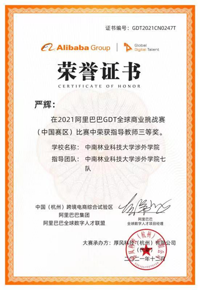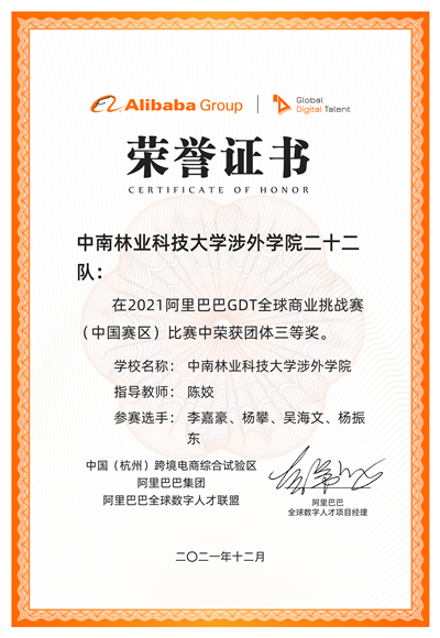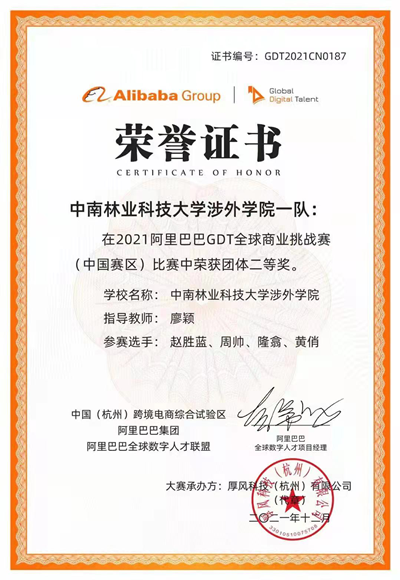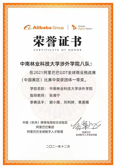 2021年,电子商务专业的学生参与多项比赛:在2021阿里巴巴GDT商业挑战赛表现优异,荣获一等奖3名,二等4名,三等奖10名。在湖南省教育厅与湖南省商务厅组织的2022年湖南省电子商务大赛跨境赛中多名同学荣获省级二等奖。在2022年全国大学生英语竞赛C类中2名同学荣获国家级三等奖。为响应全国电子商务大赛,我校特为电子商务专业设立校内电子商务大赛,中南林业科技大学涉外学院为优秀的学子会以学院名义提供创业基金。