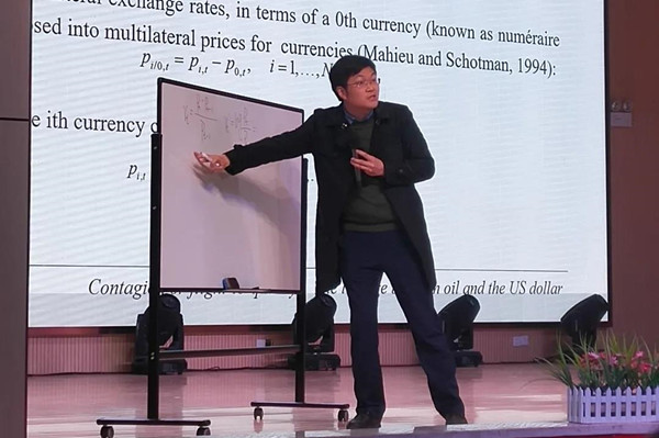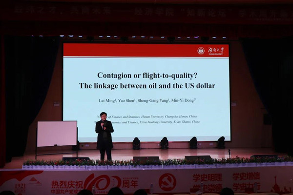 紧随着开幕式的是论坛的首场讲座,由湖南大学博士生导师明雷副教授与学院师生分享其最新研究成果《Contagion or flight-to-quality? The linkage between oil price and the US dollar based on the local Gaussian approach》。明雷副教授利用局部高斯相关模型在不同时期的五百组数据来确定在受到外部冲击时,原油与美元之间究竟是具有传染性还是一种安全资产转移。数据表明,只有在1990年海湾战争时,原油与美元之间具有传染性。在2008年和次贷危机和2014年页岩气出现时,二者之间的风险相对冲,形成了安全资产转移。而2020年原油期货负价格,二者之间的相关性不显著。为检验结果稳健性,明雷副教授利用三种不同的取样方法进行了的检验分析,发现研究结果具有稳健型。他的发言在热烈的互动氛围中让同学中真切感受到了经济学术的魅力,使同学们进一步了解市场经济的变化。