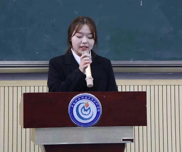 19级国贸专业5班的周婷同学作为新生代表进行发言。她提到,处于人生最美阶段的我们要富于创新同时也要慎思明辨,珍惜来之不易的机会,对自身严格要求,并倡议全体同学尊师肯学,持之以恒,努力提升专业能力和综合素质,做顺应社会发展的有用之才。