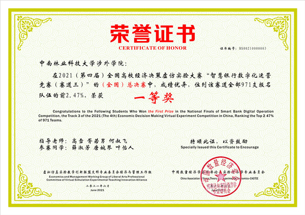2021年,金融专业学生参与各项比赛,例如湖南省大学生电子商务大赛、全国大学生博弈经济学大赛、与今日头条合作的财经征文大赛、郑商所杯、黄炎培杯、全国金融创新大赛等,学生在比赛中均获得了较好的成绩,多次获得全国一等奖、二等奖、三等奖。