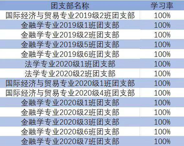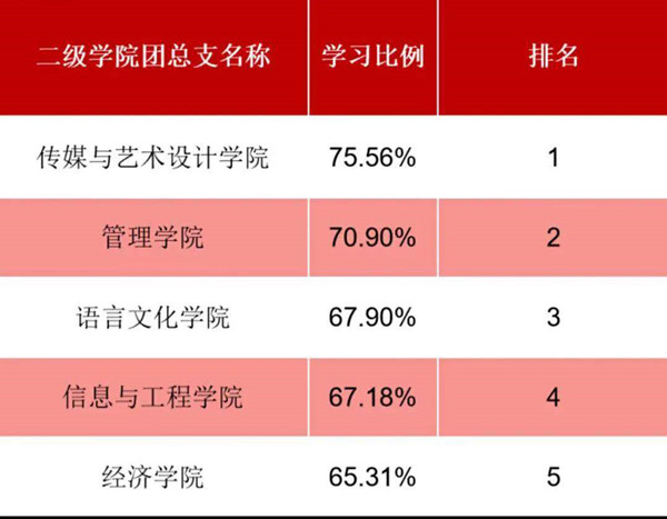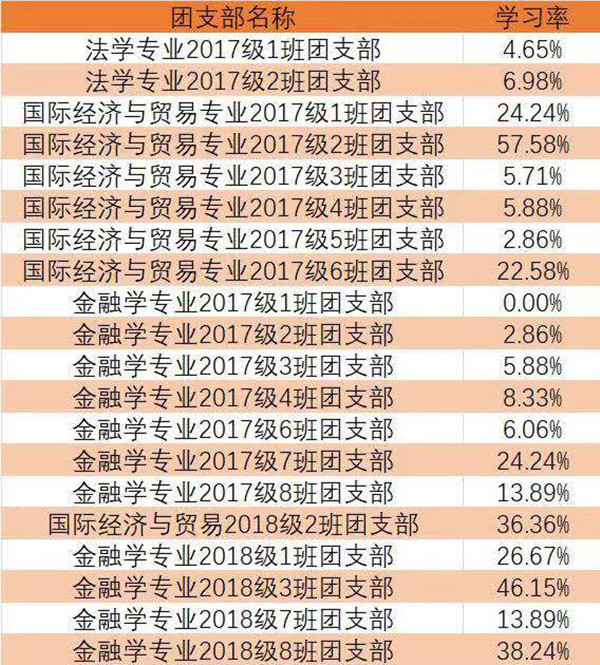 1.各团支部的学习率每周都有记录,可以关注“中南林涉外经济学院团总支学生会”公众号推文查看学习率是否达标。